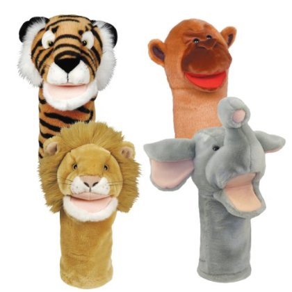 Large 12' puppets with moveable mouths are surface washable. Set of 4 zoo puppets includes tiger, lion, elephant and monkey.