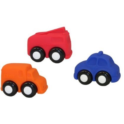 Set of 3 sturdy vehicles in bright colors includes police car, fire truck and EMS van. Approximate size 5.5”.
