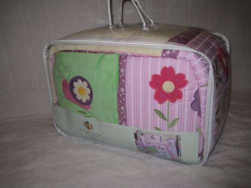8 Piece Girls Baby Crib Set;1 Comforter - 36 inches x 45 inches;2 Piece Bumper - 1 Piece -11 in. x 130 in. 2nd Piece - 24 in. x 18 in.;Fitted Crib Sheet Fits all Standard - 28 in. x 52 in.;1 Dust Ruffle - 28 in. x 52 in. One pillowcase and 2 (two) decorative pillows