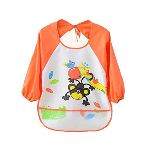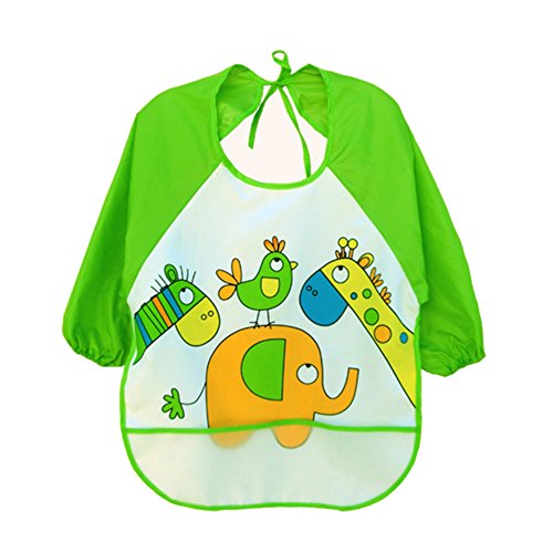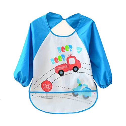 GOGO sleeved bib makes feeding time fun and easy. Made from lightweight, easy wipe, machine washable waterproof fabric, making it both comfortable and durable. Sized to fit ages 2 to 4 years, this bib features elasticized cuffs and adjustable string.