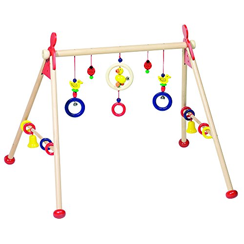 丈夫な天然木材でできたA字型のベビージムです。赤ちゃんが寝ているところに置くだけでプレーエリアを作れます。揺れるアヒルのおもちゃや、ぶら下がる鈴が赤ちゃんの好奇心をくすぐり、思わず手を伸ばしておもちゃを掴もうとします。