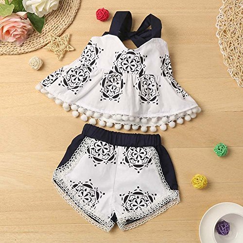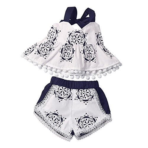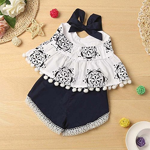 grnshtsベビー女の子ブルーとホワイト陶器印刷ホルターポンポン付きショートセットトップス+ショーツ