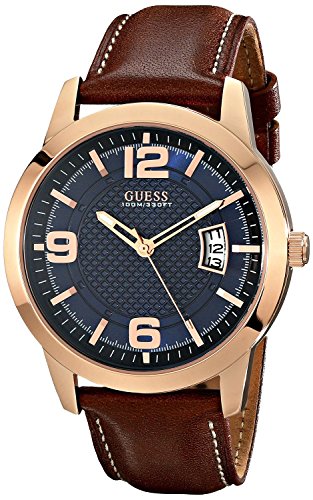 Be the man of the hour with this ultra-modern rose gold-tone timepiece. The bold navy dial plays off the brown leather strap for a sharp, forward-thinking look. Guess Watches is a timekeeping accessory company with a focus on lifestyle-driven fashion. Guess Watches launched its first collection in 1983 with a line of men's and women's fashion watches. Constant attention to new ideas and cutting-edge design keeps the brand relevant to today's trends. See all Product Description