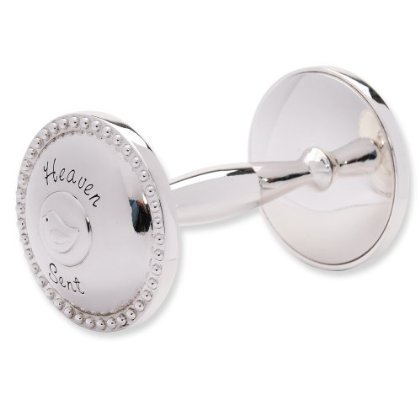 Silver plated rattle includes embossed baby chick, raised dotted border and the engraved words Heaven Sent.