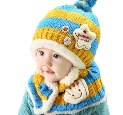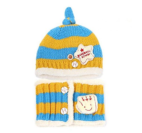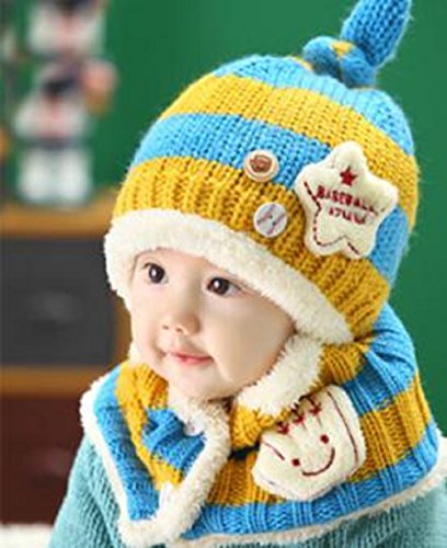 ニット帽 マフラー セット ベビー 赤ちゃん キッズ 子供 用 かわいい 防寒 ニット 帽子 (水色/イエロー)