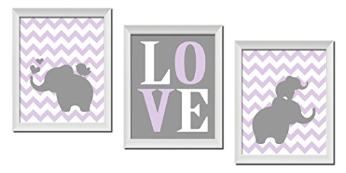 Adorableグレー、ホワイトとパープルシェブロンElephant Loveセット、Perfect for a子の部屋や子供部屋 Three 8x10in White Framed Prints