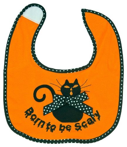 Whimsical Born to be scary cotton bib features a cute, spooky black cat with polka dot bow collar;Velcro closure;Cotton Material;Fits from birth and up