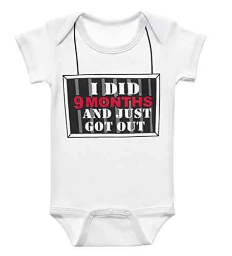 100% cotton;One piece baby t-shirt with funny saying;Message reads; I did 9 months and I just got out;Size: 0-6 months; machine wash;Cute new baby gift