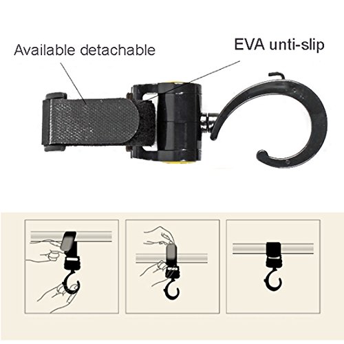 - 360度回転フック: ベビーカーや自転車のハンドルなどに簡単取付。 フック部分が360度回転するので、装着後にフックの向きが逆という原因で、再度装着し直す必要はありません。フックの向きだけ変えればOK!便利な万能グッズだから、自分用に一つ、大切なあの人にも!
