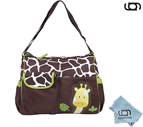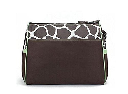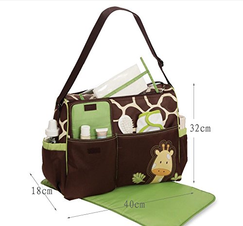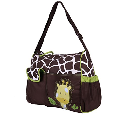 The bag has a quite large space and great layout (8 pockets) for holding everything of your baby;The shoulder strap is adjustable and easily attach to most strollers;Lovely giraffe pattern;Material: Microfiber(outside),polyester lining;Coming with an insulation feeding bottle holder, convenient to carry.