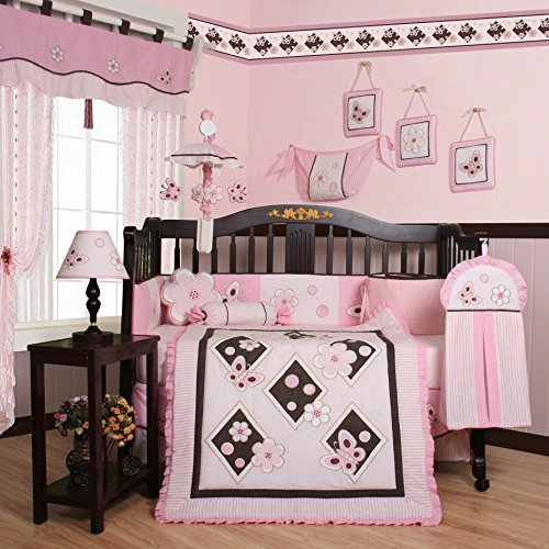 Material: 65 / 35 Percent of Polyester / Cotton;Machine washable;Sew-on pattern, not print pattern;13-piece set includes: one comforter, one bumper, one fitted sheet, one skirt, two window valances, one diaper stacker, one toy bag and two throw pillows, three wall art decor hangings;Pink Butterfly Theme
