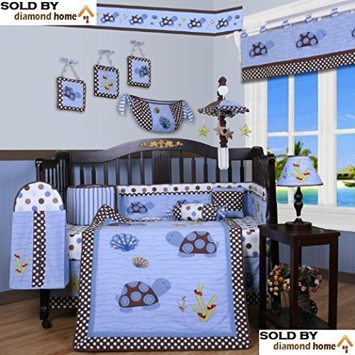 13 piece sea turtle themed bedding crib sets - neutral, unisex for boys and girls;This set includes a quilt, two valances, skirt, crib sheet, bumper, diaper stacker, toy bag, two pillows and three wall hangings.;The bedding set sports a blue color, with a graphic print of sea turtles that look adorable in any baby's nursery.;Pattern: Sea turtle animals Materials: Polyester, cotton Machine washable Blanket/Quilt: 45 L x 36 W;**ITEM INCLUDES Exclusive DIAMOND HOME EBOOK**
