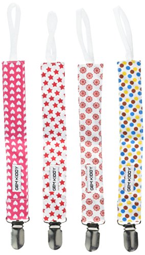 STRONG, DURABLE AND WASHABLE - Our pacifier holders are made with organic cotton and high quality clips that won't pull off but are gentle on clothes. Durable loop will attach to any style pacifier or teether and last for years to come.;100% SAFE FOR YOUR BABY - Our clips are phthalate free, latex free, lead free, BPA free & nickel-free. We care about the fabric that touches your baby's delicate skin. We make sure never to use any chemical color fixatives on our pacifier clips.;EASY TO USE & FITS MOST PACIFIERS - Easily attached to the pacifier and clip, easily attached to baby's clothes to keep the pacifier clean and safe. Best pacifier clip and holder for teething toys, soothies, baby blankets, stuffed animals, and drool bibs. You can also use these leashes as a baby blanket clip for keeping your baby covered up while riding in stroller. They look great with our Gem Kiddy Bibs too!;BACKED BY NO QUESTION ASKED MONEY BACK GUARANTEE - We guarantee you will love our pacifier clips, that's why our product is backed with a 100% Money Back Guarantee. If you are unsatisfied in any way with this product, we will refund your money, no questions asked. Give it a shot and add it to your cart today!;UNIQUE BABY GIFT SET - Our 4-pack of pacifier clips makes the best gift for new parents, grandparents, baby showers, christmas present or for any excuse to make a baby look amazing.