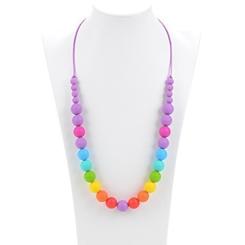 Rainbow Silicone Teething Necklace by Trendy Teething. Trendy Teething necklaces are a perfect combination of comfort with style. Moms love our fashionable, and perfectly safe for your baby necklace. There are many reasons why this is the perfect product for you and your baby: 1.) Food Grade Silicone (Perfect for babies to chew on just like pacifier material) 2.) Very easy to clean (Soap/Water and top shelf dishwasher safe) 3.) Very durable for frequent use 4.) Perfect for sensitive gums (relieves the pain for your baby while they are teething) 5.) Enhances brain stimulation and sensory skills 6.) Refrigerate for added comfort for teething baby 7.) Colorful, Fashionable, Non-Toxic 8.) Promotes longer feedings 9.) BPA Free, Phthalates Free, Lead Free, PVC Free, Latex Free, Metal Free, and Cadmium Free 10.) Breakaway Clasp for added safety and easy handling 11.) Provides closer bonding experience between mother and baby 12.) Soft and varied texture to draw baby interest 13.) Perfect as a gift for new and expecting moms 14.) Breastfeeding moms enjoy giving babies little hands something to grab onto and tug on to promote longer feedings while keeping your babies hands busy and focused 15.) Helps your baby with coordination by providing unique designs and colors to peak your baby's interest 16.) Stylish & fashionable necklace that can be worn alone or layered. 17.) Provides Mouth Sensory Sensitivity like many on the Autism Spectrum 18.) Overall great safe tool for children with developmental delays Trendy Teething is committed to providing a quality product at a quality price for all families.