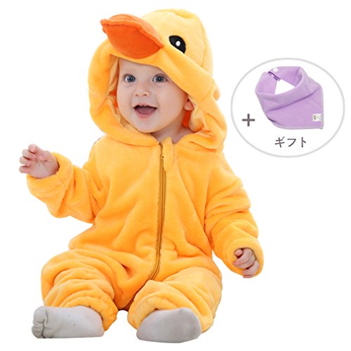 ベビー キッズ用 カバーオール フード付き 着ぐるみ 秋冬 ロンパース ジャンプスーツ 子ども服 もこもこ 防寒着 (80CM(4-12ヶ月), Yellow Duck)