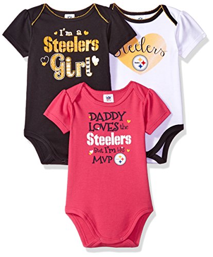 ミネソタバイキングギフトセットはガーバー(Gerber)製です。セットには3枚の異なる肌着が入っています。3枚のおそろい肌着は、綿60 %とポリエステル40 %です。パープルの肌着にはスクリーンプリントがしてあり、「I'm a Viking Girl」とその後にハートマークが印刷されています。ピンクのには「Daddy Loves the Vikings, But I'm his MVP」とその後にノーズマンのロゴが印刷されています。最後に白いボディスーツには、ハート形の上に「Vikings」と書かれ、ノーズマンのロゴも付いています。各肌着は、ストレッチな上部と股部にはスナップが付いています。
