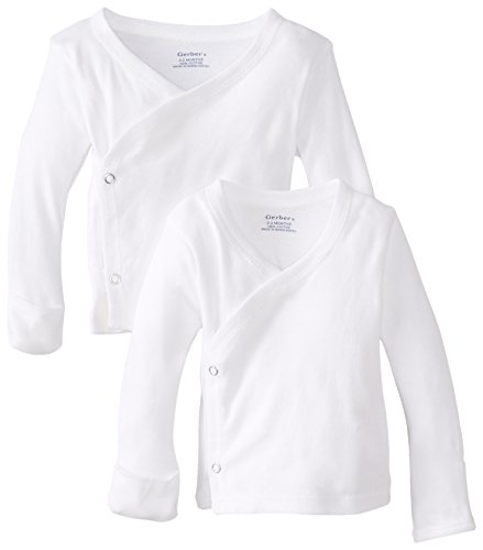 Gerber社製 2枚組 L/S サイドスナップシャツ 袖口ミトン仕様 - 白のサイドスナップシャツは重ね着の1枚として最適です。快適さと柔らかさの理由は、綿100%。前身頃サイドにスナップ留めがあり、赤ちゃんの頭をシャツにくぐらせる必要がないので、着脱の苦労がありません。また、袖口ミトン仕様で、赤ちゃんが顔を引っ掻くのを予防します。白3枚組は新生児用と0-3ヶ月用とがお買い求めいただけます。洗濯機、乾燥機使用可。贈り物に最適な商品です。