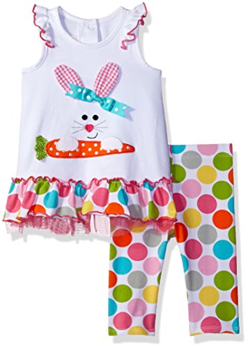 - 愛らしい女の子イースターの服をうさぎのアップリケ点灯して、ニットドレス、フリルの袖と裾にドットのプリントニットカプリ