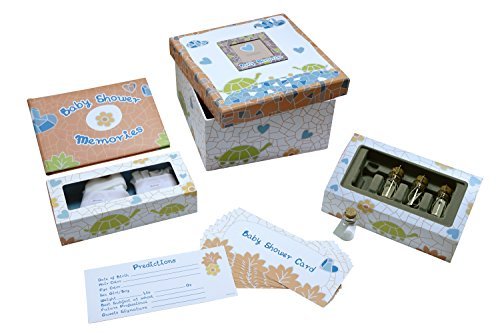 Perfect gift for any Baby Shower;Beautiful Keepsake Box with space for a first scan or photo on the front;Set includes; Baby Shower memory book, Baby Shower prediction cards;4 Keepsake glass bottles with labels for baby's first curl, first tooth, hospital band;A pair of baby mittens and baby booties