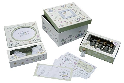 Perfect gift for any Baby Shower;Beautiful Keepsake Box with space for a first scan or photo on the front;Set includes; Baby Shower memory book, Baby Shower prediction cards;4 Keepsake glass bottles with labels for baby's first curl, first tooth, hospital band;A pair of baby mittens and baby booties
