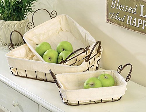 3-piece set of wire baskets are accented with beige cotton liners;Brown wire with lovely scrolled handles add to the design;Measure 13 x 11 x 6, 12 x 9 x 5.5 and 10 x 7 x 5 inches