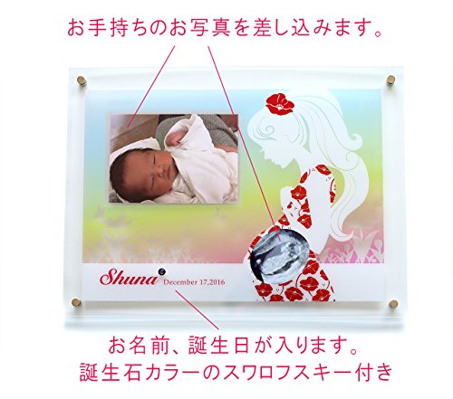 アクリルフレームの透明感を生かしたデザインが妊娠の喜び、誕生の感動を彩ります。全ての作品には7mm以上のスワロフスキーのクリスタル誕生石をあしらい、より高級感を演出。家族にとって大切な宝物である赤ちゃんのお祝いにピッタリです。