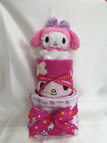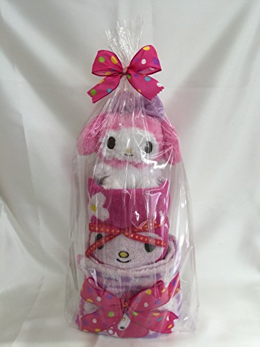 マイメロディ人形付きおむつケーキ。 赤ちゃんがよく使うフェイスタオル、ウォッシュタオル入り。 おむつはえサイズを起用しているので、しばらく飾って頂けます。 出産お祝はもちろん、誕生日プレゼントにも。