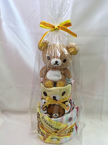リラックマ人形付きおむつケーキ。 赤ちゃんがよく使うフェイスタオル、ウォッシュタオル、ミニタオル入り。 おむつはMサイズを起用しているので、しばらく飾って頂けます。 出産お祝はもちろん、お誕生日プレゼントにも。