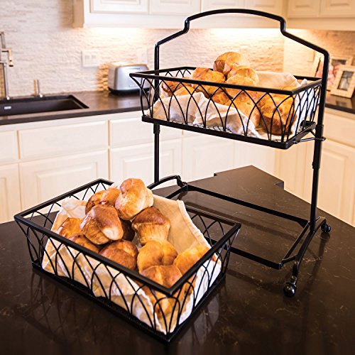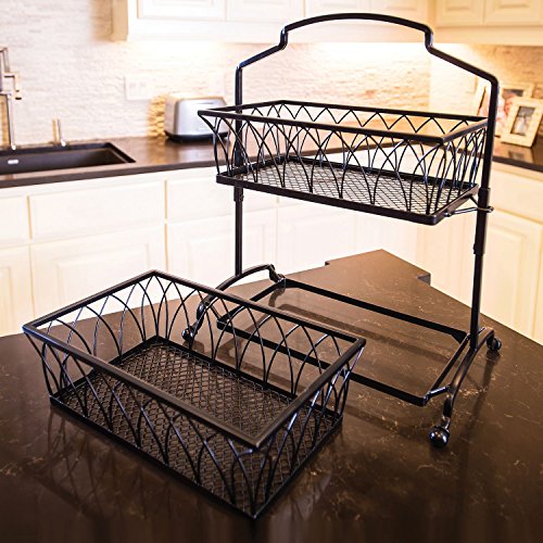 Versatile two-tiered basket;Great for anywhere in the house;Crafted from sturdy 100% wrought iron;Baskets are removable;Comes fully assembled