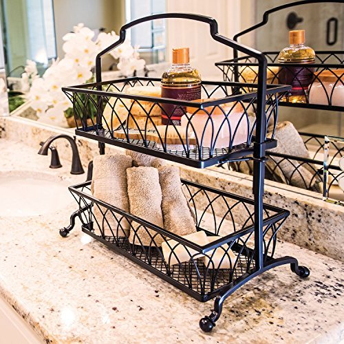 Versatile two-tiered basket;Great for anywhere in the house;Crafted from sturdy 100% wrought iron;Baskets are removable;Comes fully assembled