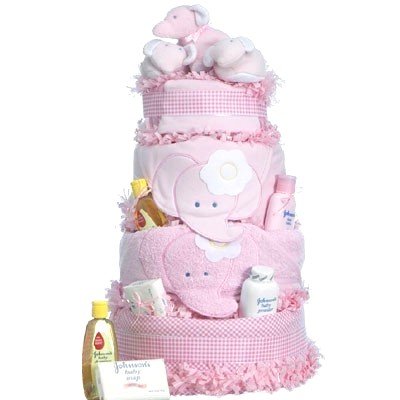 Diaper Cake ingredients: 100% Cotton Gown ??Matching Hat ??Elephant character hooded Towel ??Receiving Blanket ??Elephant Booties ??Elephant appliqued Bib ??Terry Toy ??4 Diapers ??Johnson & Johnson Baby Lotion ??Johnson & Johnson Baby Shampoo ??Johnson & Johnson Baby Powder ??Johnson & Johnson Baby Soap;32 inches tall;The option to include a gift message and ship directly to the intended recipient will be available during the check out process.