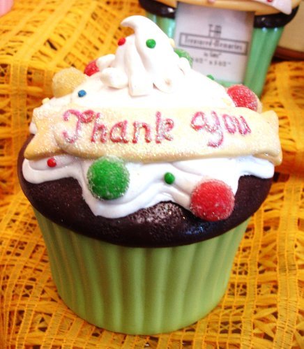 Design: Cute cupcake trinket box with a green wrapper, chocolate cake, white icing, multicolored candies and sprinkles, and a small banner with Thank You message.;Size: 4.25 H x 3.5 D;Material: ceramic and resin