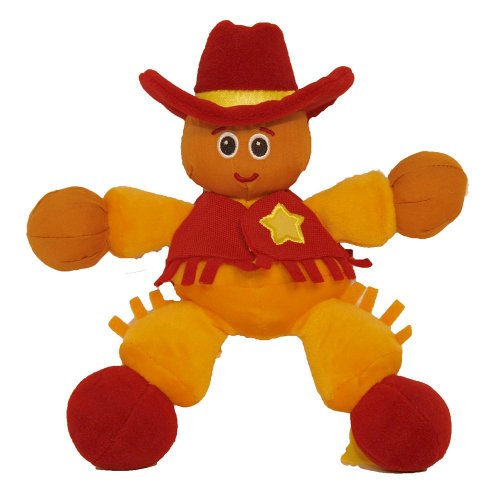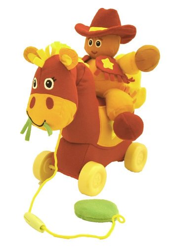 'Howdy Partner' Duke The Cowboy is a plush go anywhere attachable to anything. It is a convenient plastic attachment link on back. This has a floppy and friendly, sized right for little hands to grasp. It has features like feel the crinkle in my vest, gentle rattle in my hat, feel my soft fringe, hands and feet are sized just right for little hands to grab. This attaches to Giddy Up's saddle. It is appropriate from Birth 36 months.