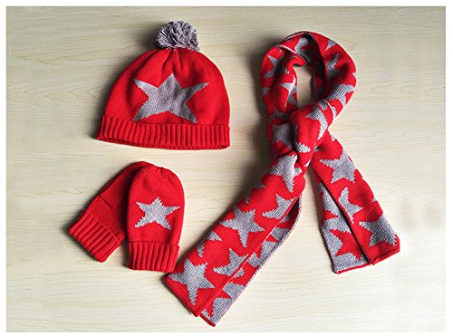 (Ginty)ニット帽 セット 子供用 マフラー&手袋 セット 星柄 可愛い ハット キッズ クリスマス プレゼント 誕生日 秋 冬 女の子 防寒 キャップ (L, 赤)