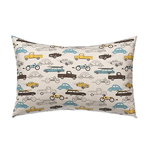 Fun vintage vehicles of all kinds zoom across this retro styled print;Clean lines, modern design. Purchase our Custom Sham Filler for a perfect fit. Machine wash and tumble dry;Sewn with a split back for easy cleaning. Overall size 28W x 18H;Hand sewn in USA. Quality fabrics last longer for years of enjoyment;Decorating the room has never been easier with a wide variety of coordinating Traffic Jam bedding and decor including Vinyl Decals, Fabric Canvases, Pillows, Window Treatments, Lighting, Poufs and Framed Art