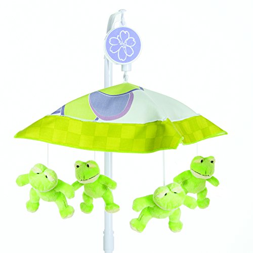 Fits crib rails up to 2 1/4 wide;Develops hand and eye coordination and visual tracking skills;Features 2 plush frogs that ribbit and 2 vintage dragonflies crafted from wooden clothespins