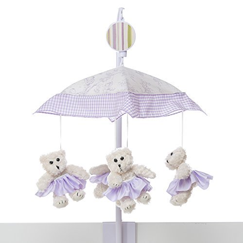Lull your little one into a soothing sleep with our musical mobile;Wind up musical mobile gently turns while playing brahms' lullaby;Fits crib rails up to 2 1'4 wide;Develops hand / eye coordination and visual tracking skills;Features white plush bears in lavender tutus dancing under a fabric canopy