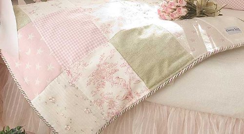Patchwork design of pink and green in an array of fabrics including toile, soft velvet, woven gingham, embroidered rosebuds., Soft solid reversible, with a twisted cord trim., Measures 34" wide by 42" long., A perfect size to wrap baby in cozy comfort or use as a stroller blanket., Premium fabrics last longer. Machine wash and tumble dry.