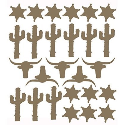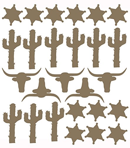 It's easy to add color and visual texture to nursery walls with these vintage western motif vinyl decals. Sold as a sheet of 26 decals. 9 cacti (6.5 x 3"). 5 steer (6.5 x 3"). 12 sheriff badges (3.5 x 3.5"). Coordinating thumbs up cowboy decal and stallion decal sold separately. Decals are easy to apply and won't damage walls when removed. Apply to any hard surface, walls, mirrors, doors, or any other surface you can think of. Installation instructions included.