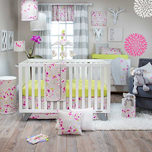 Includes: Quilt, Crib Sheet, and Crib Skirt;Blossom print is complemented by a shimmery soft gray woven velvet, a mini polka dot in apple green and a calming white velvet.;Hand made in the USA
