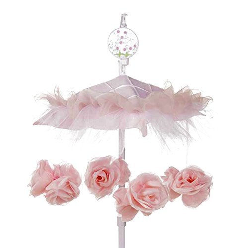 Mobile plays the classic Brahms' Lullaby, Beautiful pink rose drops, Fits crib rails up to 2.25 inches wide., Easy to follow assembly instructions are included, Coordinates with the Secret Garden crib bedding collection by Glenna Jean