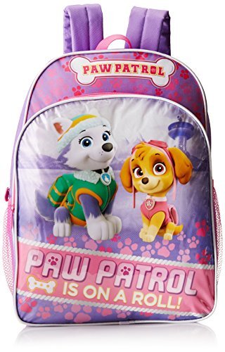 Paw patrol backpack featuring the two main girl characters skye and everest from the hit nickelodeon show in vibrant purple background. Paw patrol fans will love this bag.