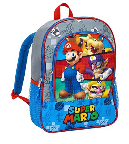 Popular Super Mario Bros. characters are featured with this standard size 16 inch backpack. This kids backpack features Mario, Wario, King Koopa and Waluigi. Backpack is multi purpose for school, travel, books, laptop and accessories. This full size kids backpack is great for travel, indoor camp, sleepovers, slumber parties and more. A great gift for kids or toddler. Features characters from the popular Super Mario Bros. video games and toys. 100% polyester. Ages 3 and up