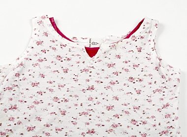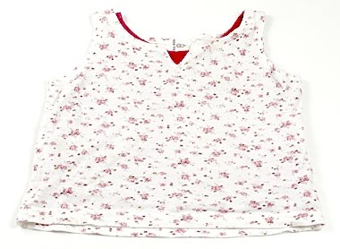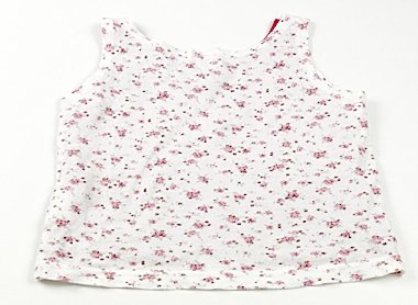 白地に花柄の表地の下に、ローズピンクの2枚重ねになったデザインで、丈は短めのタンクトップです。全体的に使用感があり、多少しみがありますが、洗い替えの一着にいかがでしょうか。