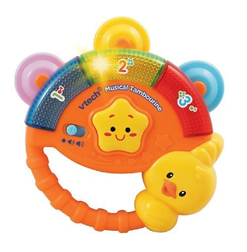 The VTech Musical Twinkle & Learn Tambourine helps your baby learn 1-2-3 and listen to fun tunes by pressing the big star shaped button and shaking the tambourine. There are three colourful lights that will flash along to the sounds and melodies, and tambourine pieces that make shaking even more fun. There is also a cute bird on the large and easy-to-grasp handle that makes this tambourine appealing to your baby. The VTech Musical Tambourine rewards baby as they learn that their actions have reactions, encourages fine motor skill development, and enhances musical skills with music and sound activities.