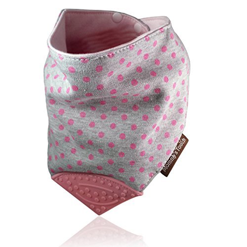 The Mommy's Touch reversible teething bib is a unique combination of a drool bib and teether that combines the popular dribble bib concept with an attached chewable teether. This helps prevent the loss or dropping of teething toys and teethers while on the go. The bibs are made from super soft and absorbent cotton to keep the moisture on the bandana and off of your little ones clothes and neck so they don't develop a rash. They are super comfortable to wear and have an attached textured teething triangle to massage and sooth tender gums and encourage new teeth to break through. Machine washable in cold or warm water.