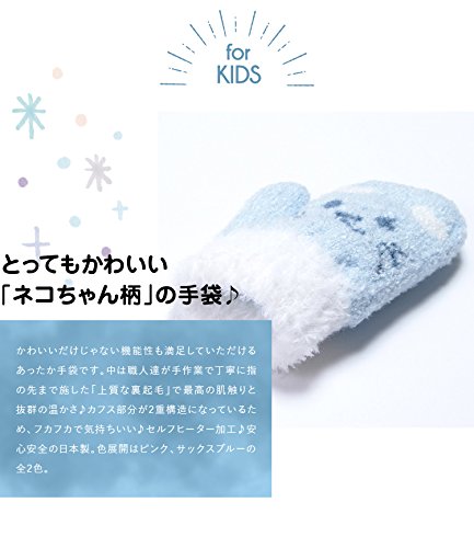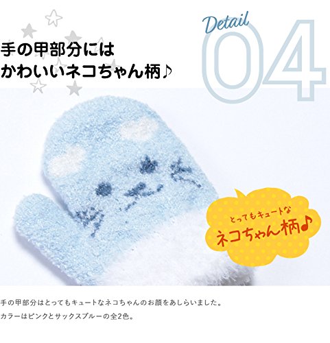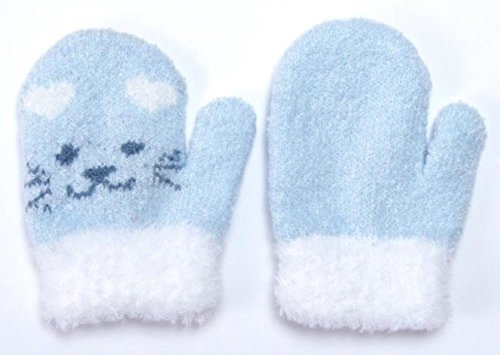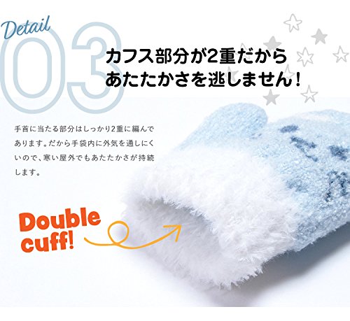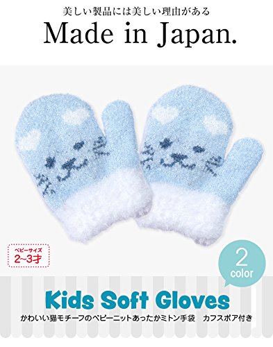 かわいい猫モチーフのベビーニットあったかミトン手袋 カフスボア付き サックスブルー