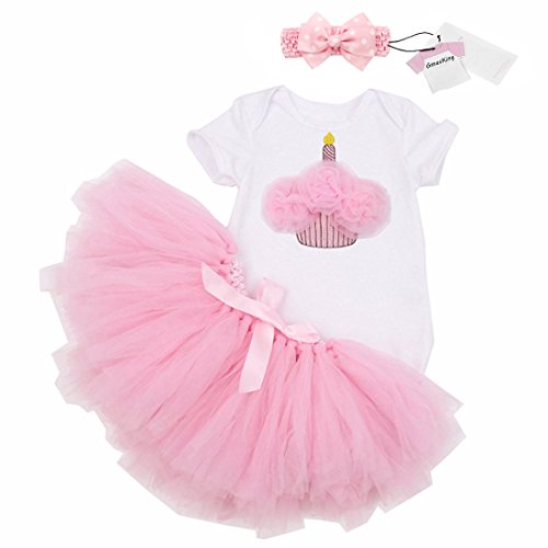 Gmasking 子供ドレス 女の子ワンピース ロンパース ピンクスカート リボン飾り 3点 セット (M(3-6Months), 誕生日ケーキ)