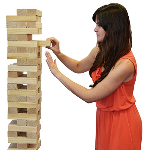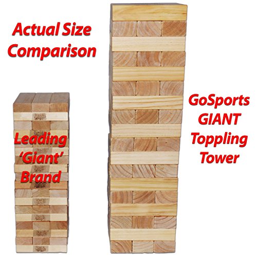 The GoSports giant toppling Tower is a giant version of one of America's favorite party games. The set is made out of giant size Pine wood blocks with smooth sanded edges. The Tower starts out at 2.5 ft tall and can grow to over 5 ft during games. The obj
