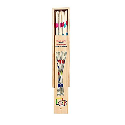 Play the classic game of pick up sticks with this European Mikado set. These sticks include stripes which award different points. The Mikado is a special spiral striped stick with the highest points. The natural wooden pick up sticks set includes striped